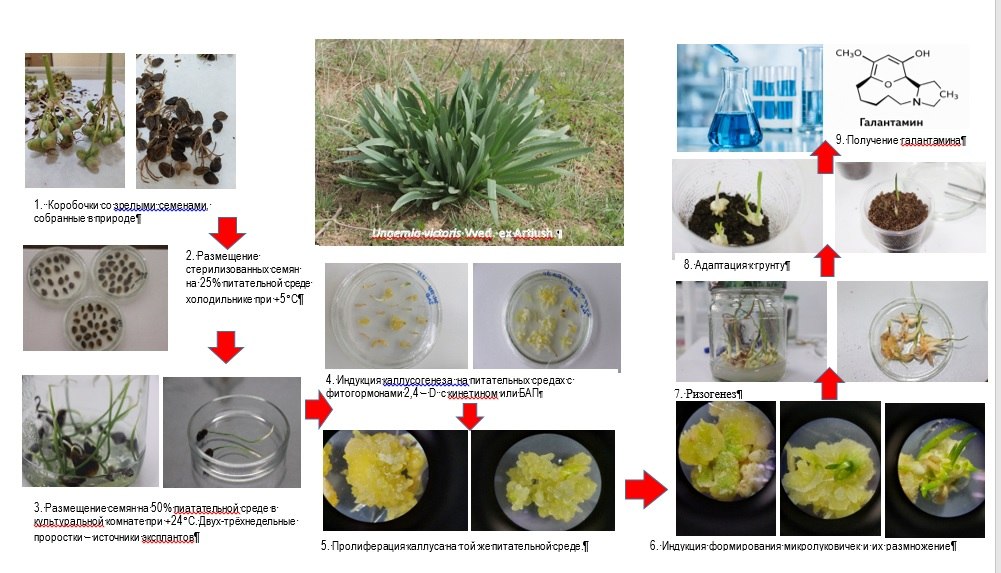 Biz o'simlik hujayralari biotexnologiyasi ( in vitro texnikasi) yordamida noyob dorivor o'simlik Ungernia victoris dan biologik faol birikmalar olish usulini ishlab chiqdik bu usul o‘simlik hujayra biotexnologiyasi (in vitro)ga asoslangan.